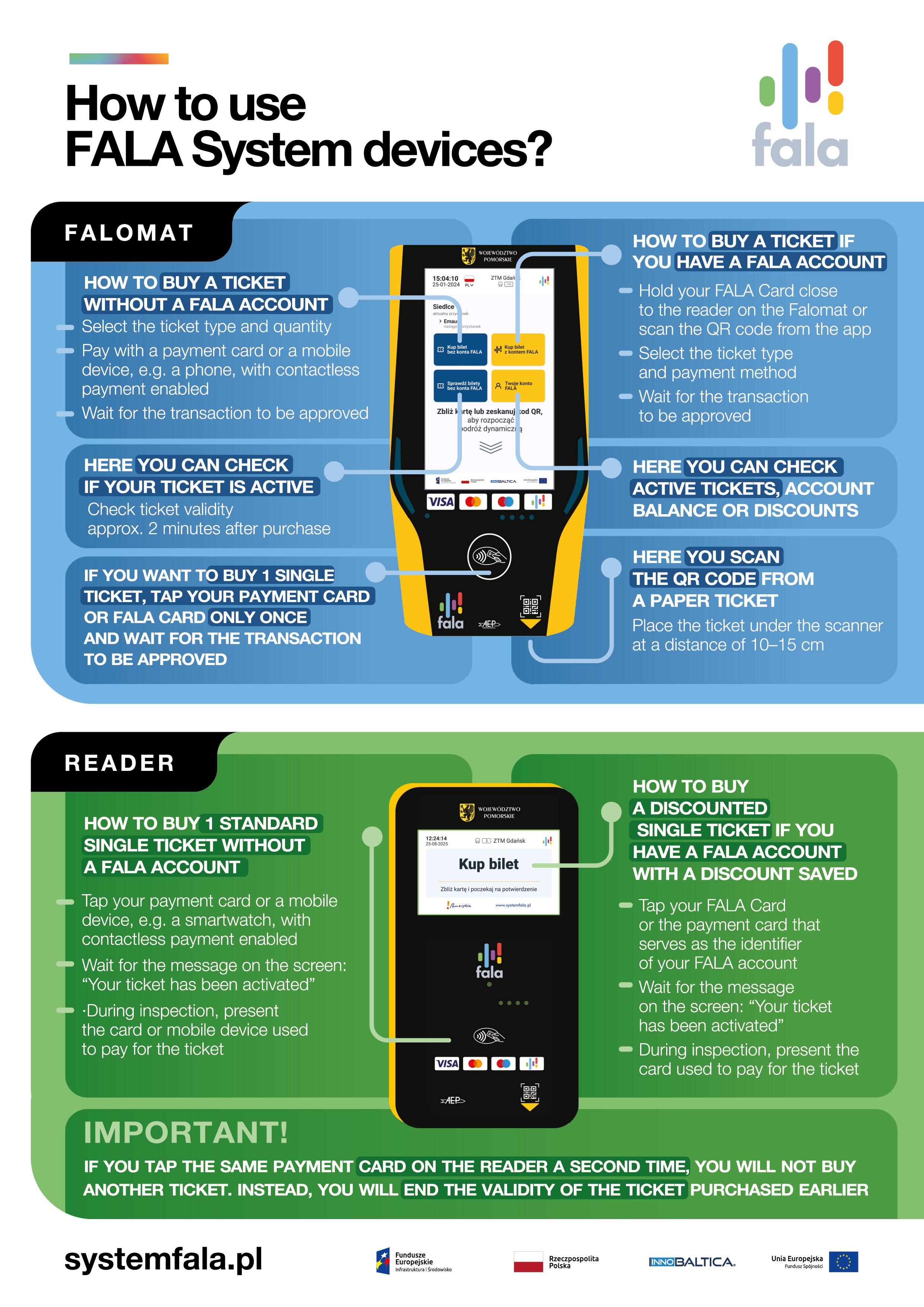The FALA System is a set of tools that make your travels by public transport in the Tricity more enjoyable and eco-friendly. With FALA, you don’t need to look for a kiosk or ticket machine to buy a ticket – the "kiosk" in the form of a device called a falomat can be found in every vehicle (bus, trolleybus, and tram) as well as on platforms and train stations.
