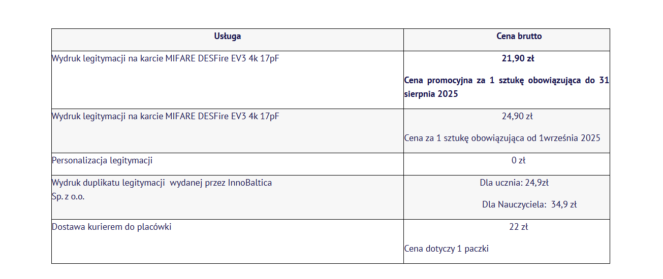 Podana cena legitymacji dotyczy pojedynczej karty podstawowego wzoru legitymacji tj. MEN-I/1, MEN-I/2, MEN-I/3, MEN-I/4