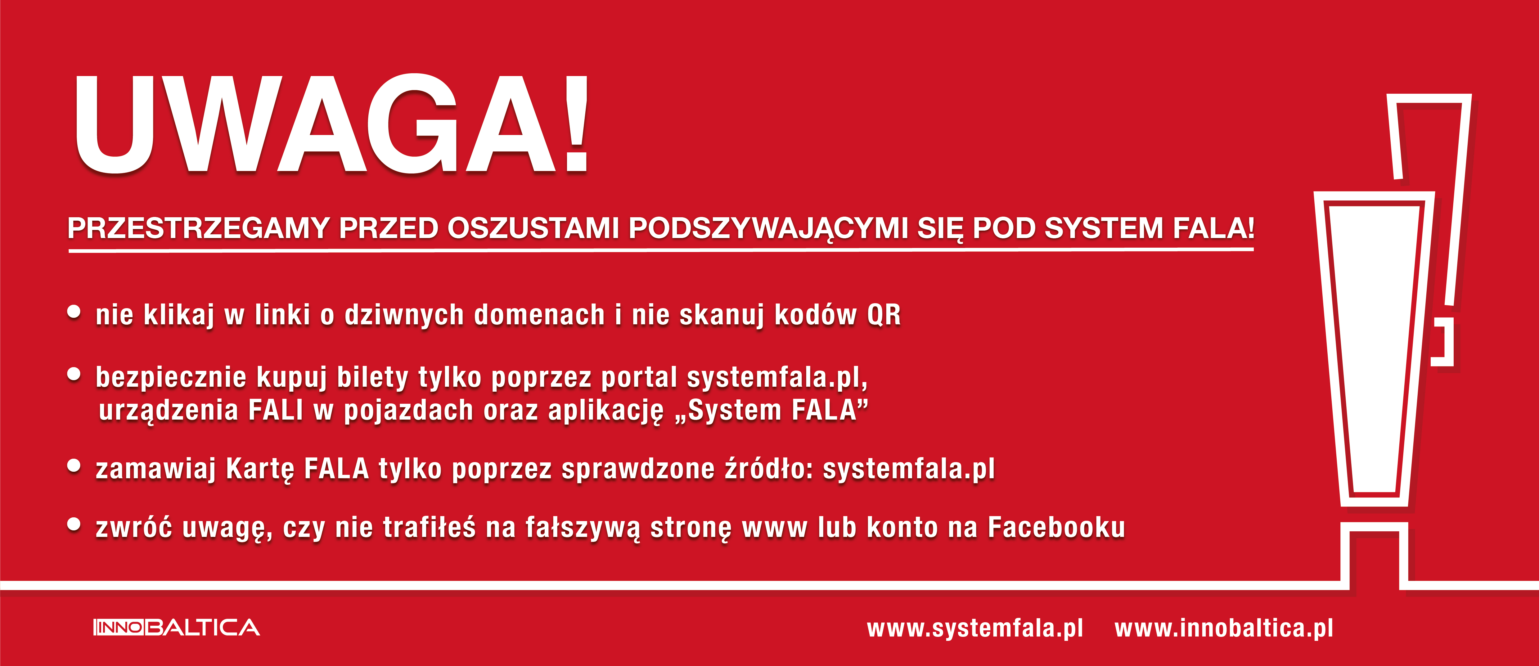 W związku z wykrytymi próbami wyłudzeń, spółka InnoBaltica informuje, że nie sprzedaje kart podarunkowych Systemu FALA, a jedyną stroną internetową, przez którą można zamówić Kartę FALA jest https://systemfala.pl/. Spółka powiadomiła policję o oszustach, próbujących pobierać pieniądze za zakup Karty FALA poprzez fałszywe strony internetowe oraz profile społecznościowe.